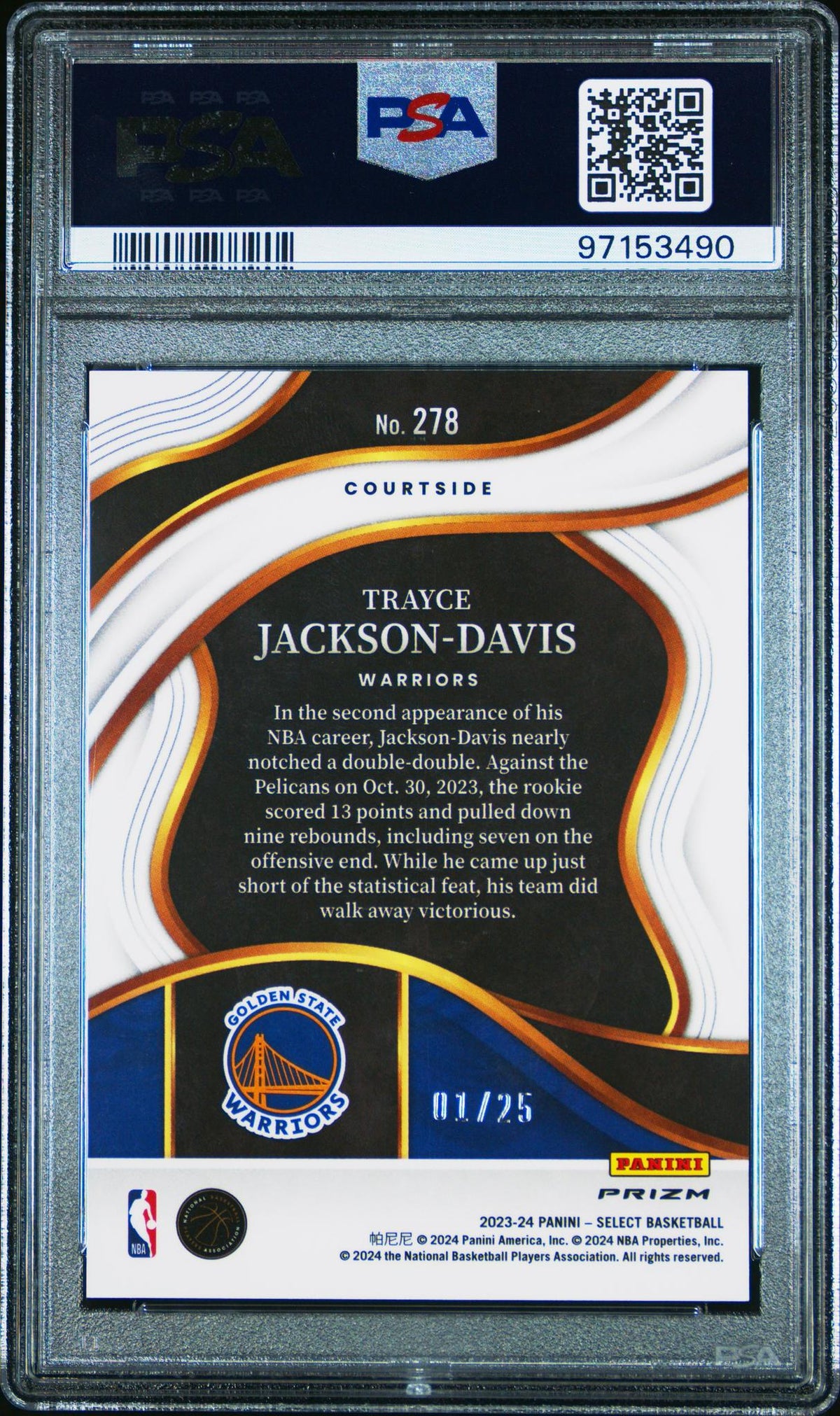 This card is a dazzling display of the young and dynamic player, Trayce Jackson-Davis from the NBA's Warriors team. A true gem in every sense, this card is a rookie card, encapsulating the early glories and potentials of Trayce's basketball journey. Integral to its allure is the fact that it is a part of the coveted Courtside insert set, adding a layer of exclusivity to its ownership.