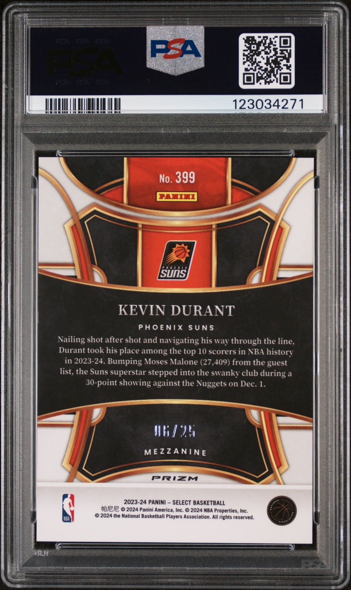 This card doesn't just tell the story of Kevin Durant, the Phoenix Suns, or the 2023 NBA season. It tells your story as a passionate collector, a fervent NBA fan, and a true admirer of the sport. Don't miss the chance to own this piece of basketball history. Grab this Kevin Durant 2023 Select Mezzanine card today and let it be the slam dunk addition to your collection!