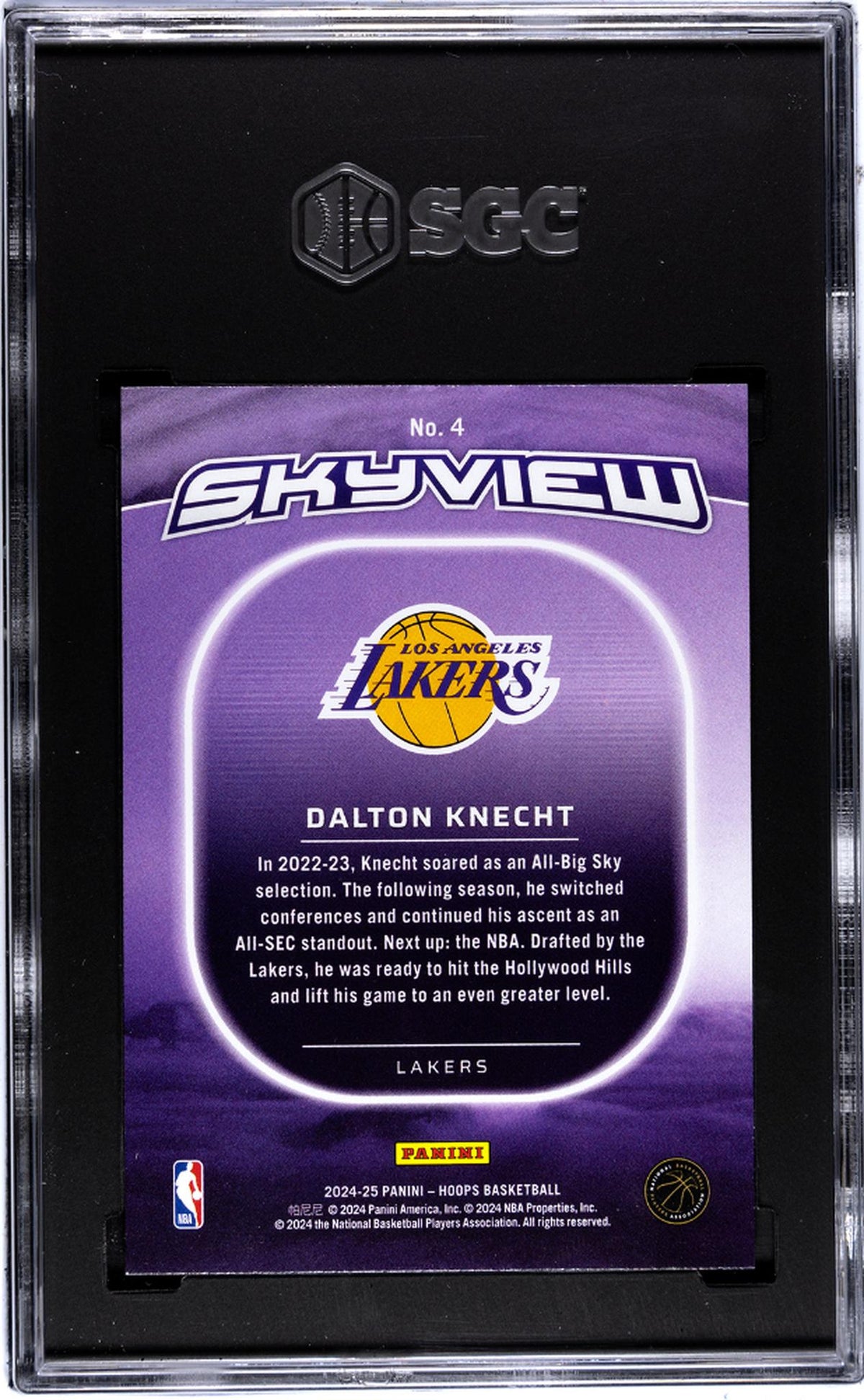 Immerse yourself in the world of basketball with this captivating 2024 Hoops 4 Dalton Knecht SGC 9.5 card, an exquisite piece of memorabilia that will allure any NBA enthusiast. Manufactured by the renowned Panini under the Hoops brand, this card features Dalton Knecht, one of the shining stars of the Los Angeles Lakers.