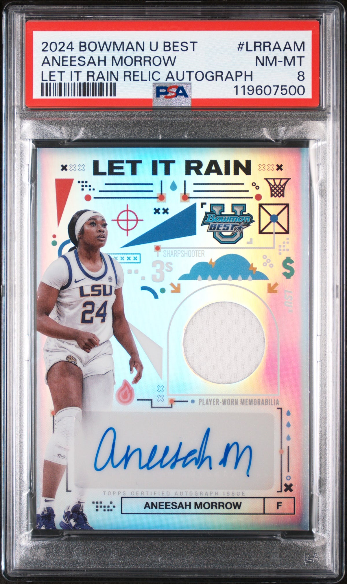 Immerse yourself in the world of sports memorabilia with this exceptional 2024 Bowman 'Let It Rain' Aneesah Morrow card. Manufactured by the renowned brand Topps, this card has been professionally graded by PSA and has been given an NM-MT, 8 grade, showcasing its near-pristine condition.