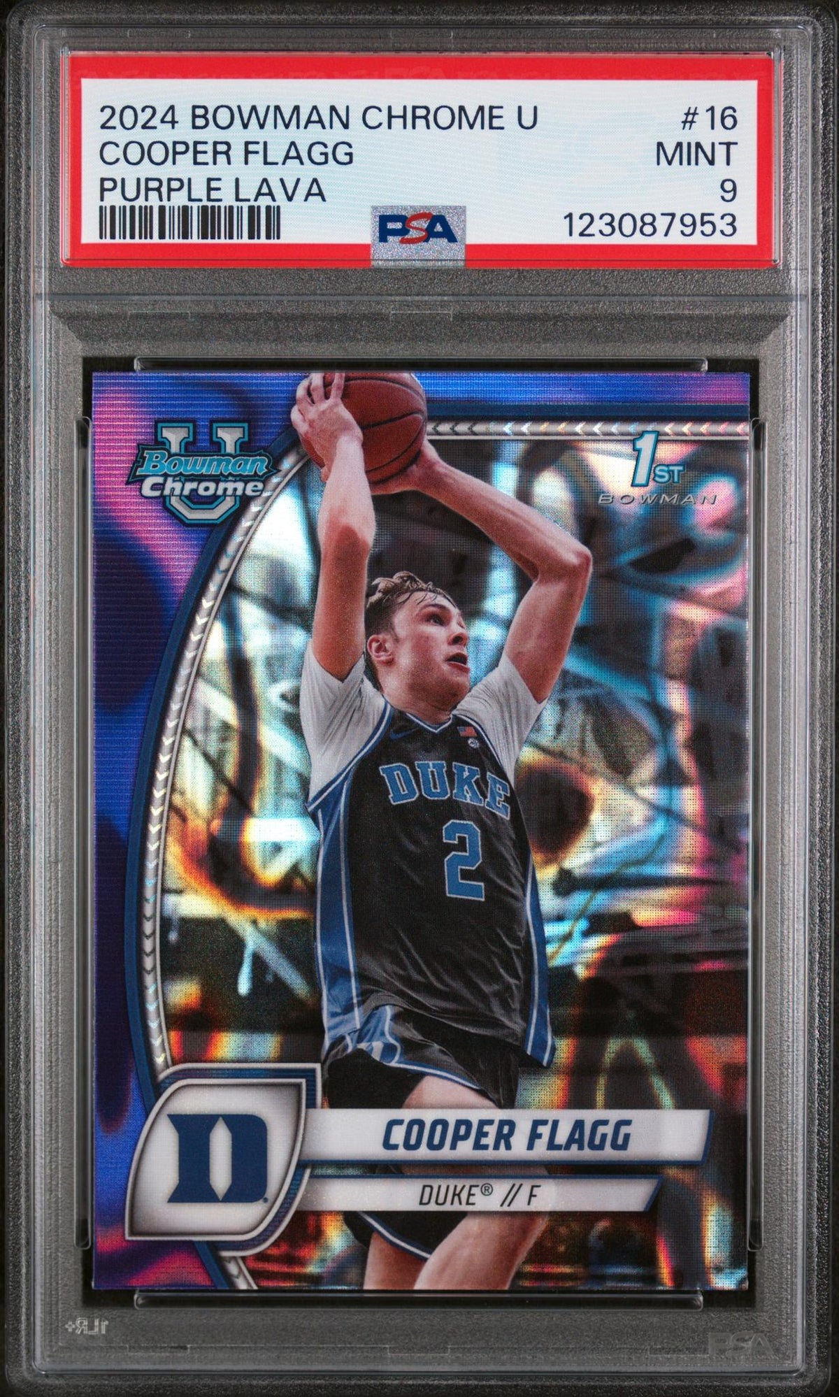 Capture the excitement of the court with this stunning 2024 Bowman Chrome #16 Cooper Flagg sports card! Manufactured by the renowned Topps and part of the sought-after Bowman Chrome series, this card features the alluring 'Purple Lava' parallel design, adding a unique and vibrant touch that sets it apart in any collection.