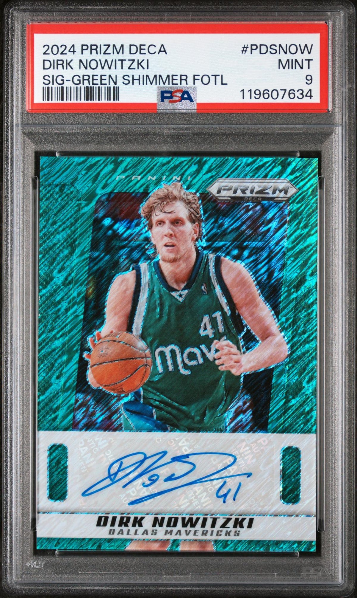 2024 Panini Prizm Deca Green Shimmer FOTL Dirk Nowitzki #PDS-NOW Auto /15 PSA 9