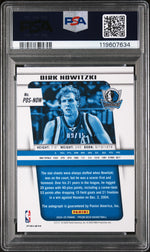 Immerse in the history of NBA with the stunning 2024 Panini Prizm #PDS-NOW Dirk Nowitzki card from the highly sought-after Deca Insert set. This card is a real gem, boasting an autograph from the legendary Dallas Mavericks player himself, Dirk Nowitzki. As a testament to its rarity, it's one of only 15 ever made, with this particular card being the 9th in the series. This spectacular piece comes in a lustrous Green Shimmer FOTL parallel, adding a unique charm that is sure to attract both avid collectors and casual fans alike. The card has been professionally graded by PSA and awarded a numeric grade of 9, signifying its mint condition. This reflects not just its aesthetic appeal, but also its perfect preservation of Nowitzki's legacy. Adding to its allure, this card is a part of the celebrated Prizm Deca set - a brand synonymous with quality and prestige within the basketball card collecting community. While it's not a rookie card, it encapsulates a memorable time in Nowitzki's illustrious career with the Dallas Mavericks in the NBA. This card doesn't just capture a moment, it's a tangible piece of basketball history, embodying the spirit and prowess of Dirk Nowitzki. Whether you're a die-hard Mavericks fan, a basketball card enthusiast, or simply someone who appreciates the beauty of a well-crafted sports card, this is an opportunity to own a piece of NBA history. Don't miss out on adding this extraordinary card to your collection.