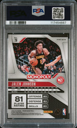 This 2024 Prizm #26 Jalen Johnson B&W card is a part of the Monopoly Prizm Basketball set, a set that brings together the thrill of the game and the intrigue of the Monopoly Man. It's a graded collectible, a piece that's as valuable as it is visually appealing.
