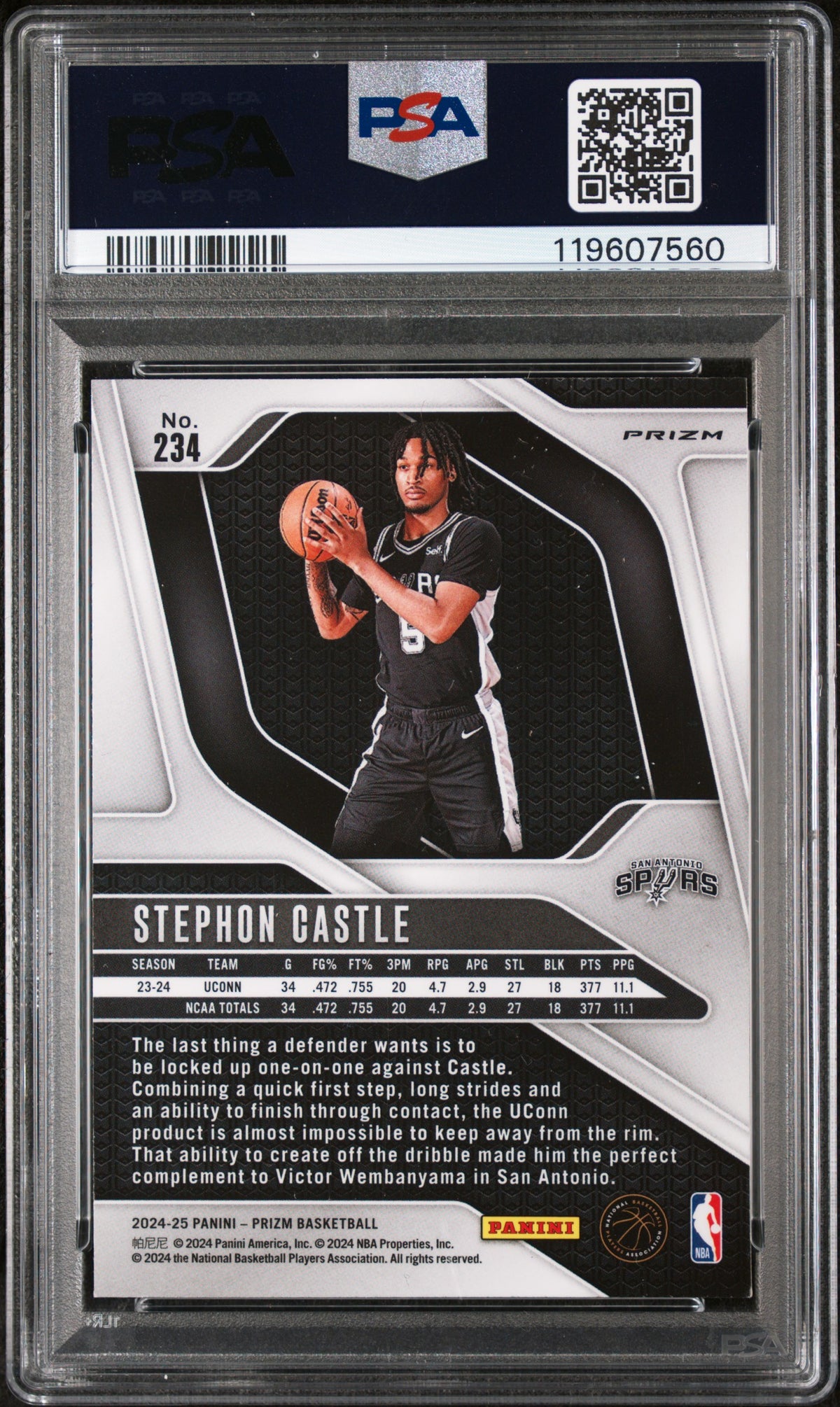 Behold the pinnacle of sports card collecting with this extraordinary 2024 Panini Prizm Red Ice Rookie Card of the phenomenal Stephon Castle. Representing one of the shining stars of the San Antonio Spurs, this card is a must-have for any serious NBA aficionado. This card emanates from the highly sought-after Prizm Basketball 2024-25 set by renowned manufacturer Panini, known for their superior quality and attention to detail. The card's Red Ice parallel design gives it a unique and captivating appearance, enhancing its visual appeal and collectability. What makes this item a real gem is its exceptional grade. Graded as a 9-Mint by the prestigious PSA, a trusted authority in card grading, this card is preserved in an outstanding condition. The Mint grade signifies only the smallest of defects, meaning the card has maintained its original factory freshness and sharpness of corners, edges, and surface. Additionally, this card is a tribute to Castle's rookie year, making it even more valuable. A rookie card is the first trading card issued during a player's first year of play, making it more desirable and a solid investment. With its combination of superior craftsmanship, pristine condition, and the representation of an incredible athlete in his rookie year, this card is more than just a collectible. It's a piece of NBA history. This is not just a card; it's an investment in sports legacy, a token of basketball glory. Don't miss out on the opportunity to own this piece of sports memorabilia. This is an absolute must-have for any Stephon Castle, San Antonio Spurs, or NBA fan or collector. Add it to your collection today and watch its value soar!