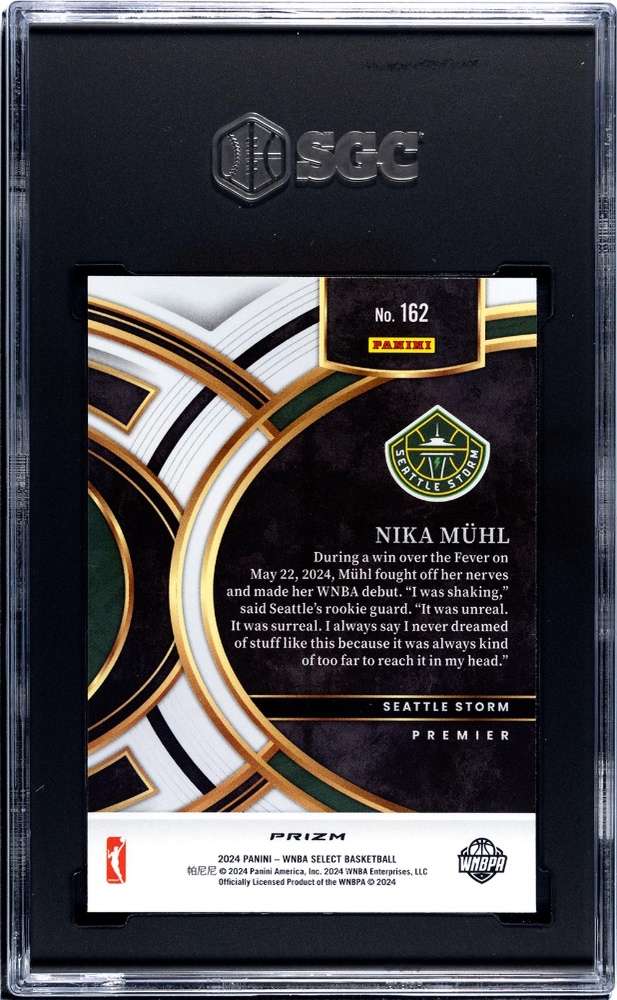 Step into the world of professional basketball with this superb card featuring the rising star Nika Muhl. Manufactured by the renowned Panini under the Select brand, this card encapsulates the prowess of a player whose contribution to the Seattle Storm team in the WNBA league is truly commendable. This card is a prized possession for any sports enthusiast, primarily because it's part of the illustrious 2024 Select collection. Its card number 162, combined with a vibrant Silver Prizm parallel design, makes it a standout piece in any card lineup. One of the most exciting features of this card is that it's a rookie card, capturing the essence of Nika Muhl's early career. This card truly resonates with the energy and potential of this budding star, making it a valuable addition to your collection. Adding to its attraction is the fact that this card has been professionally graded by SGC, an industry leader in card grading. With a whopping score of 9.5, this card is categorized as Mint+, a testament to its exceptional condition and high quality. This card is part of the WNBA Select Basketball set, a must-have for any basketball card collector. The card does not include any autograph or memorabilia, but its intrinsic value lies in its depiction of Nika Muhl, a performer par excellence on the basketball court. Overall, this card is a collector's item in the basketball card category. Its unique features - a rookie card, a Silver Prizm parallel, a high grade from SGC, and being part of the WNBA Select Basketball set - all add up to make it a covetable piece for any sports card enthusiast. Don't miss the chance to add this gem to your collection!