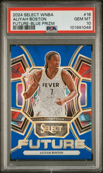 Introducing the exceptional 2024 Panini Select Future-Blue Prizm card featuring the mesmerizing talent, Aliyah Boston. This card adds an element of prestige and elegance to any collection, boasting a pristine condition rated PSA 10 - GEM MT by the esteemed grading company, PSA.