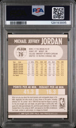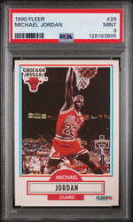 Behold the timeless treasure of the basketball world - a phenomenal 1990 Fleer card featuring the legendary Michael Jordan! This card, from the esteemed Fleer manufacturer, hails from an era when Jordan was at the peak of his career with the Chicago Bulls team. The card's crisp and clean appearance, along with its exceptional finish, is a true testament to the Mint condition ascribed to it. This is not just a card, it's a piece of NBA history which was professionally graded by PSA securing a respectable numeric grade of 9. A perfect addition to any sports card collection, this card stands out not just for its aesthetic appeal but also for the iconic player it represents. Remember, it's not just about owning a sports card, it's about owning a memento that commemorates the golden era of basketball and the man who redefined the sport, Michael Jordan. This 1990 Fleer #26 Michael Jordan card is a must-have for any serious collector or basketball enthusiast. Secure this card and own a piece of the legacy that is Michael Jordan.