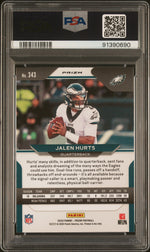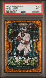 The card proudly features the Philadelphia Eagles' star quarterback, Jalen Hurts, in his rookie year. The dynamic player image combined with the unique disco prizm finish gives this card a vibrant, energetic feel that mirrors Hurts' exhilarating on-field performance.