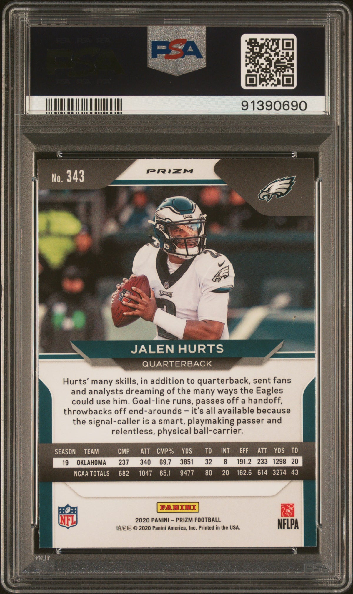 Behold the striking 2020 Prizm #343 Jalen Hurts Disco card, an absolute must-have for any discerning sports card collector. Hailing from the esteemed Panini Prizm collection, this gem is not just any card but a rare 'Disco Prizm' parallel card, making it an exceptional find.