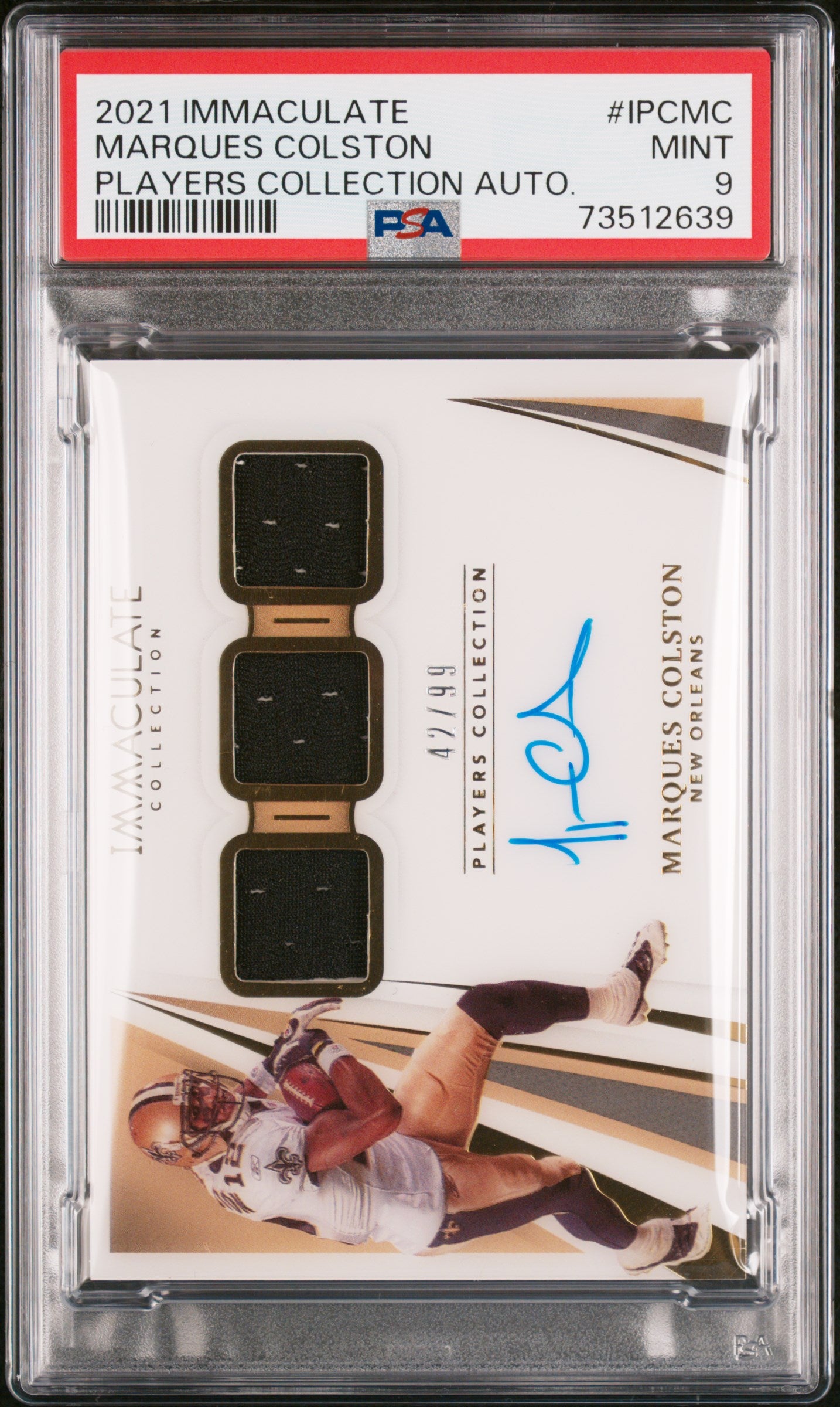 The 2021 Immaculate IPC-MC Colston 47/99 PSA 9 card is a splendid blend of sports and artistry. It's a perfect addition to any football card collection, or a spectacular gift for an NFL enthusiast. This is not just a sports card, but a testament to Marques Colston's impact on the game, making it an absolute must-have for anyone who appreciates the essence of American football.