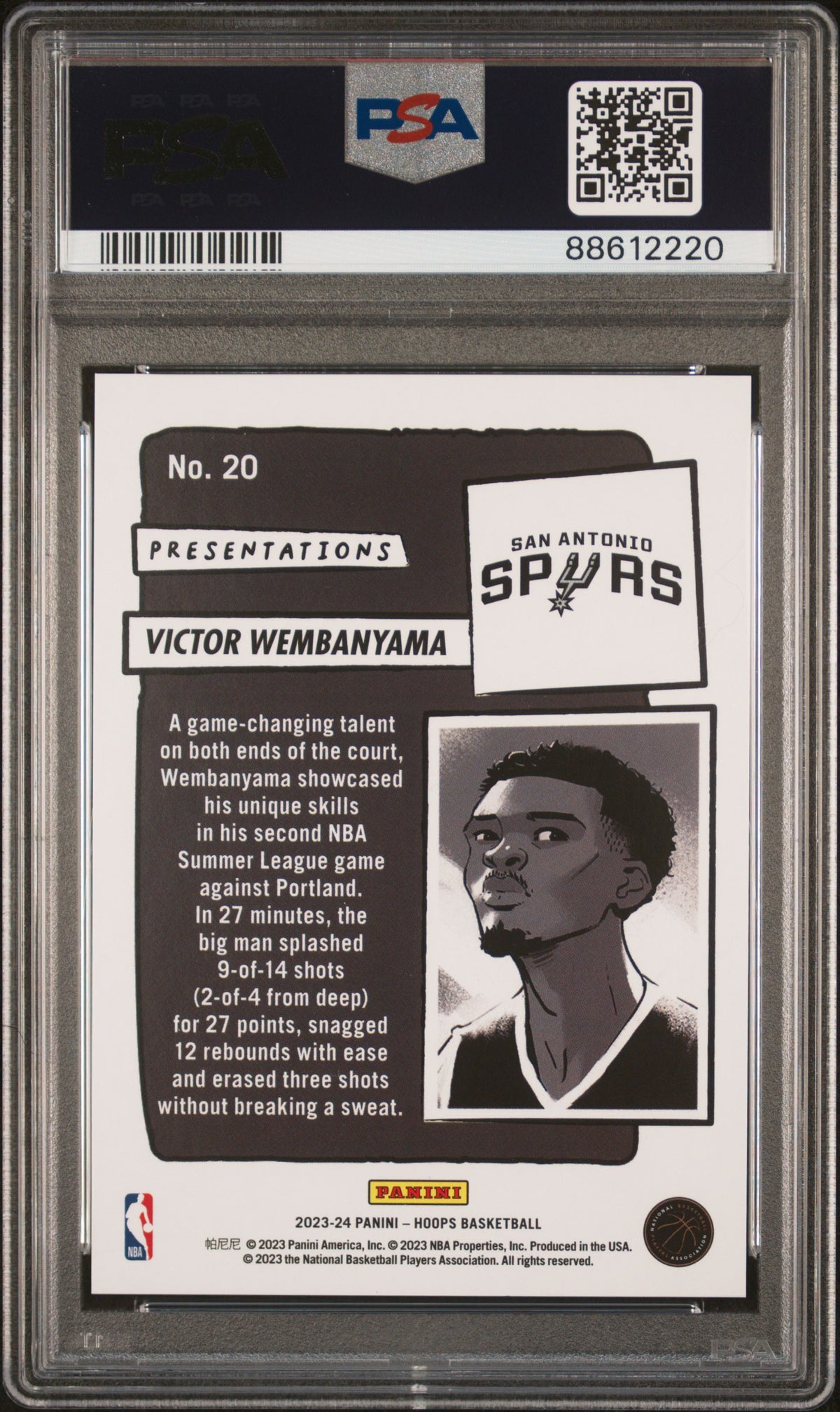 Add this Victor Wembanyama, NBA Hoops Presentations insert to your collection and celebrate the dynamism and excitement of basketball. This gem is a perfect blend of sports and art, capturing the spirit of the game, the promise of a rising star, and the quality of a top-tier brand. Indulge in the thrill of the chase with this gem mint graded card and bring home a piece of the NBA. Happy collecting!