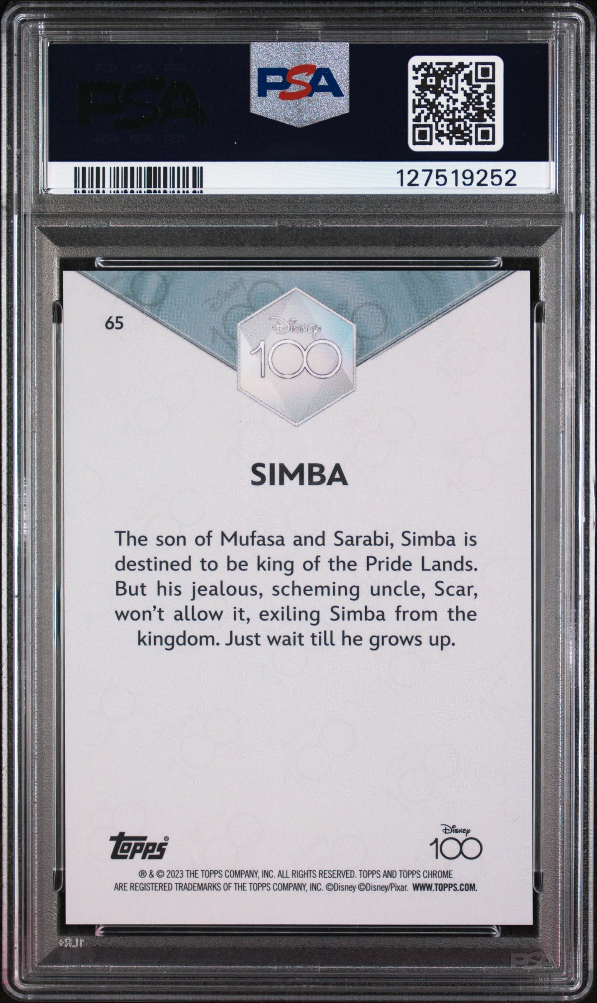 The 2023 Topps Chrome #65 Simba card is truly a treasure in the realm of card collecting. Its enchanting design, limited availability, and flawless condition make it more than just a card - it's a miniature piece of art. Whether you're a Disney aficionado, a card collecting veteran, or a novice in the hobby, this card is a gem that will shine brightly in any collection. Don't miss your chance to own a piece of Disney magic!