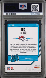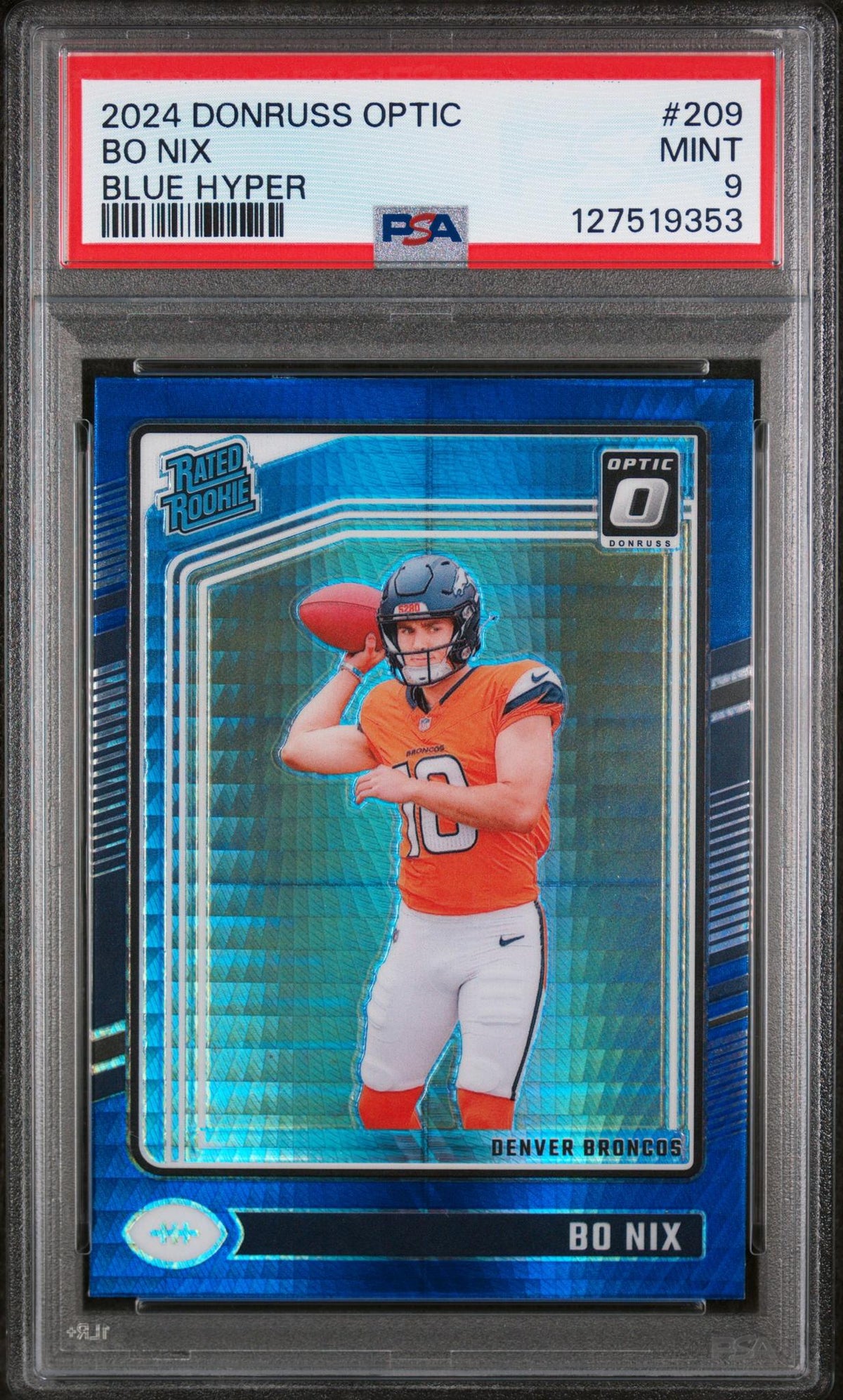 Prepare to elevate your sports card collection with this stunning 2024 Donruss Optic #209 Bo Nix Blue Hyper PSA 9. Brought to you by the reputable manufacturer, Panini, this card is part of the lauded 'Donruss Optic Rated Rookie' set, a must-have for any serious collector.