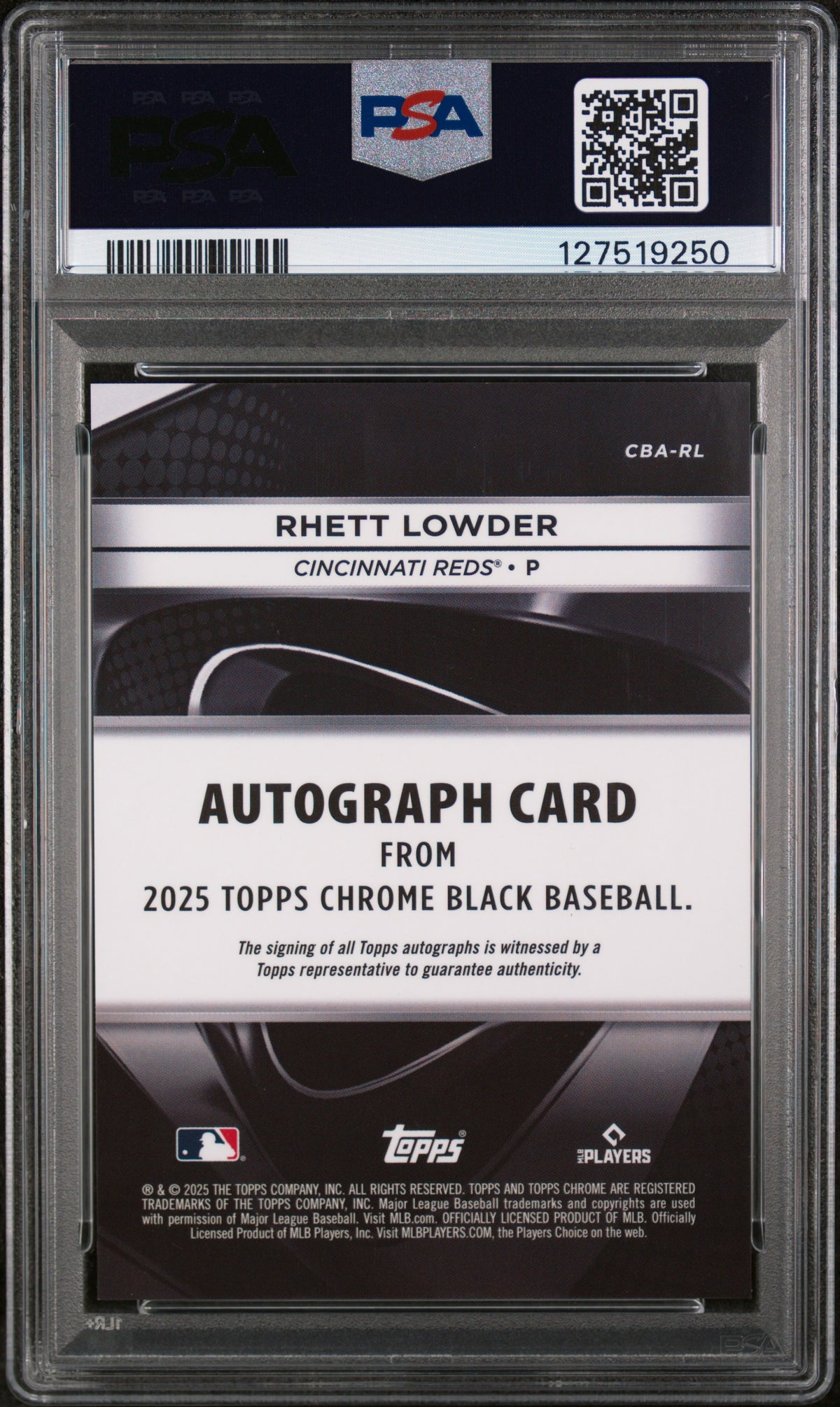 The card is professionally graded by PSA, one of the most trusted grading companies in the industry. With a numeric grade of 9, it's in mint condition, promising longevity and a lasting sheen. This is a rookie card, encapsulating Rhett Lowder's promising start, making it a valuable asset for years to come.