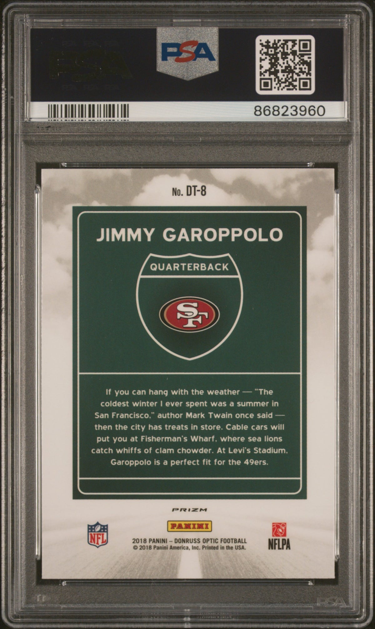 Indulge in the thrill of owning this 2018 Donruss Optic DT8 Jimmy Garoppolo card from the Downtown Insert Set. It's more than a card, it's a piece of sports history. Don't miss out on the opportunity to call it your own.