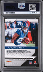 The card features the dynamic and talented Saquon Barkley, a celebrated player from the New York Giants team. A name synonymous with skill and agility, Barkley's card is a must-have for any sports enthusiast. The card's appeal is magnified by its mint condition, preserving the vibrant colors and intricate details, making it a great addition to any collection.