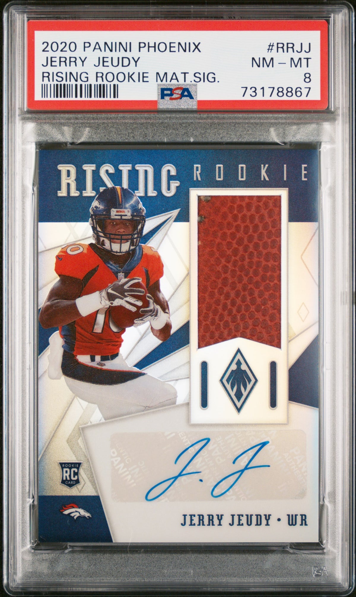 Indulge in the excitement of collecting with this spectacular 2020 Panini Phoenix Rising Rookie Jerry Jeudy card. This exceptional piece of sports memorabilia showcases the Denver Broncos' shining star, Jerry Jeudy, during his rookie year. Not only does this card offer a glimpse into the promising start of Jeudy's NFL career, but it also features his authentic autograph, further enhancing its value and appeal. This card, issued by the esteemed manufacturer Panini under the Phoenix brand, stands out due to its limited availability. With only 75 in circulation, this card is serial-numbered at 18/75, making it a rare find for any serious collector. Its desirability is further accentuated by the included jersey memorabilia, which offers a tangible connection to Jeudy's on-field performance. What sets this card apart is its professional grading by PSA, a respected name in card grading. Boasting a high numeric grade of 8, this card is in Near Mint to Mint (NM-MT) condition, reflecting its excellent preservation and quality. Whether you're a fan of Jerry Jeudy, a Denver Broncos enthusiast, or a collector of football cards, this Rising Rookie insert is a must-have. Its key features - the Rising Rookie insert, Jerry Jeudy's autograph, jersey memorabilia, and PSA grading - come together to create a piece that's rich in sports history and high in collector's value. Don't miss out on the opportunity to own this piece of Jerry Jeudy's rookie year legacy.