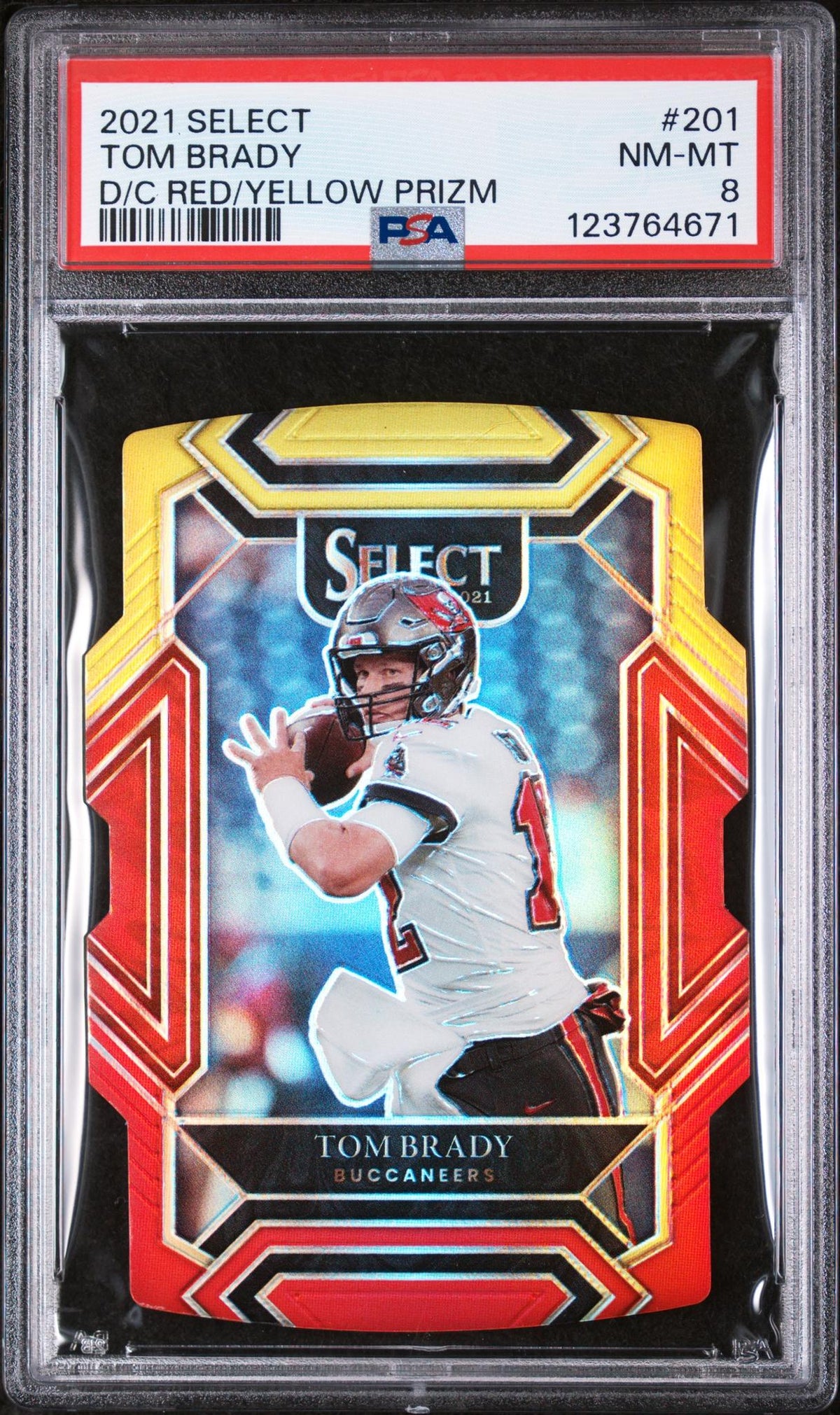 Ideal for football enthusiasts and collectors alike, this card is a tangible piece of Tom Brady's legacy. The uniqueness of this card lies in its key features including being a part of the 2021 Select set, the Red/Yellow Prizm parallel, and its professional grading by PSA.
