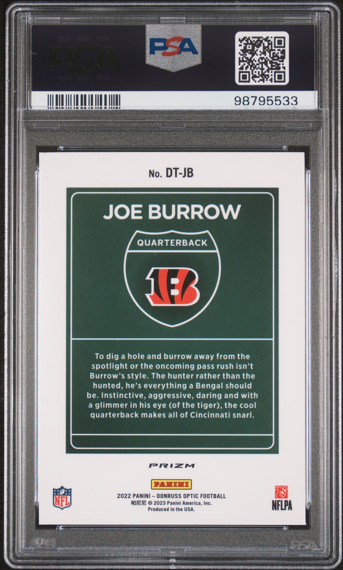 So, gear up to add this sparkling piece of sports artistry to your collection or gift it to a Bengals fan or a sports card enthusiast. This 2022 Donruss #DT-JB Joe Burrow PSA 9 card is more than just a collectible, it's a celebration of NFL, it's a tribute to Joe Burrow, and it's a symbol of your passion for football!