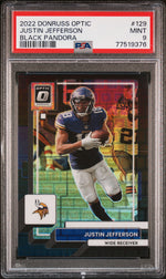 Step into the exhilarating world of NFL with this striking 2022 Panini Donruss Optic card featuring the dynamic Justin Jefferson of the Vikings. This card is part of the revered Black Pandora insert set, known for its exclusive, eye-catching design. What makes it truly special is its limited production - this is card number 16 out of only 25 ever made, enhancing its rarity and collectible appeal. The card is not just a visual delight but also a symbol of excellent condition and quality, having been professionally graded as 'Mint 9' by the prestigious PSA grading company. This grade reflects the card's pristine condition and assures its premium value in the market. Moreover, even though this is not a rookie card, it still commands immense value as it showcases Justin Jefferson, a promising talent in the NFL and a shining star of the Vikings. Whether you're a die-hard Vikings fan, a Justin Jefferson follower, or a sports card collector, this card is a must-have addition to your collection. Key features of the card include its Black Pandora parallel, signaling a high level of desirability and exclusivity. As a part of the much-loved Donruss Optic Black Pandora card set, it stands as a testament to the high production standards of Panini, a trusted name in the sports card industry. In summary, this Justin Jefferson card is a splendid fusion of sports memorabilia and collecting excellence. It is a testament to the player's prowess on the field, the Vikings' spirit, and the thrill of the NFL. Secure this card today and own a piece of sports history that blends quality, rarity, and the love of the game in one stunning collectible.