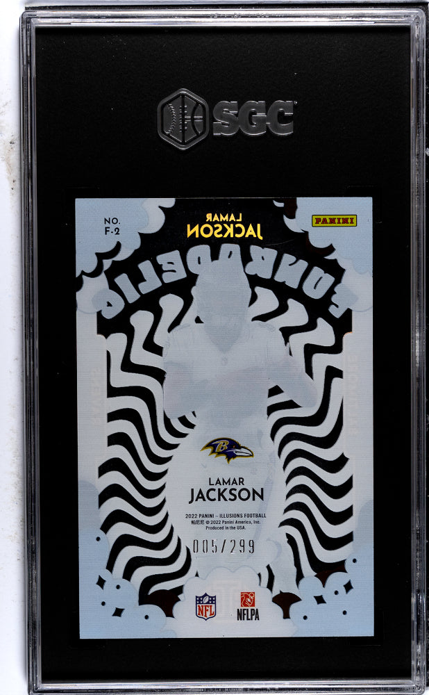 Step into the world of refined sports card collecting with this stunning 2022 Panini Illusions F-2 Lamar Jackson card. Manufactured by the esteemed Panini, this card comes from the Illusions brand and belongs to the highly sought-after 'Funkadelic' insert set. A marvelous celebration of Lamar Jackson's prowess on the football field, it's a fantastic addition to any serious NFL fan's collection.