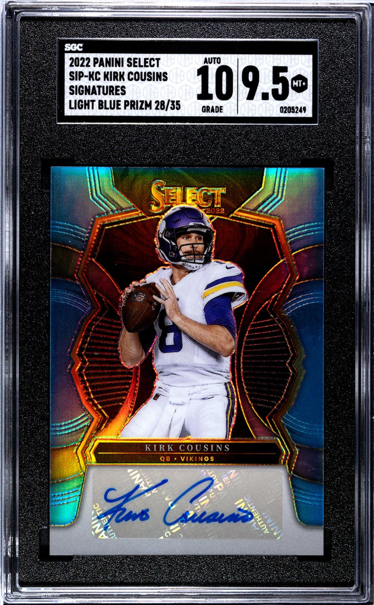 Key features include the coveted Kirk Cousins autograph, a limited serial number of 28/35, and the unique Light Blue Prizm finish that makes this card a standout. It goes without saying that this card is a gem from the Panini Select Signatures series, a collection known for its premium quality and superb design.