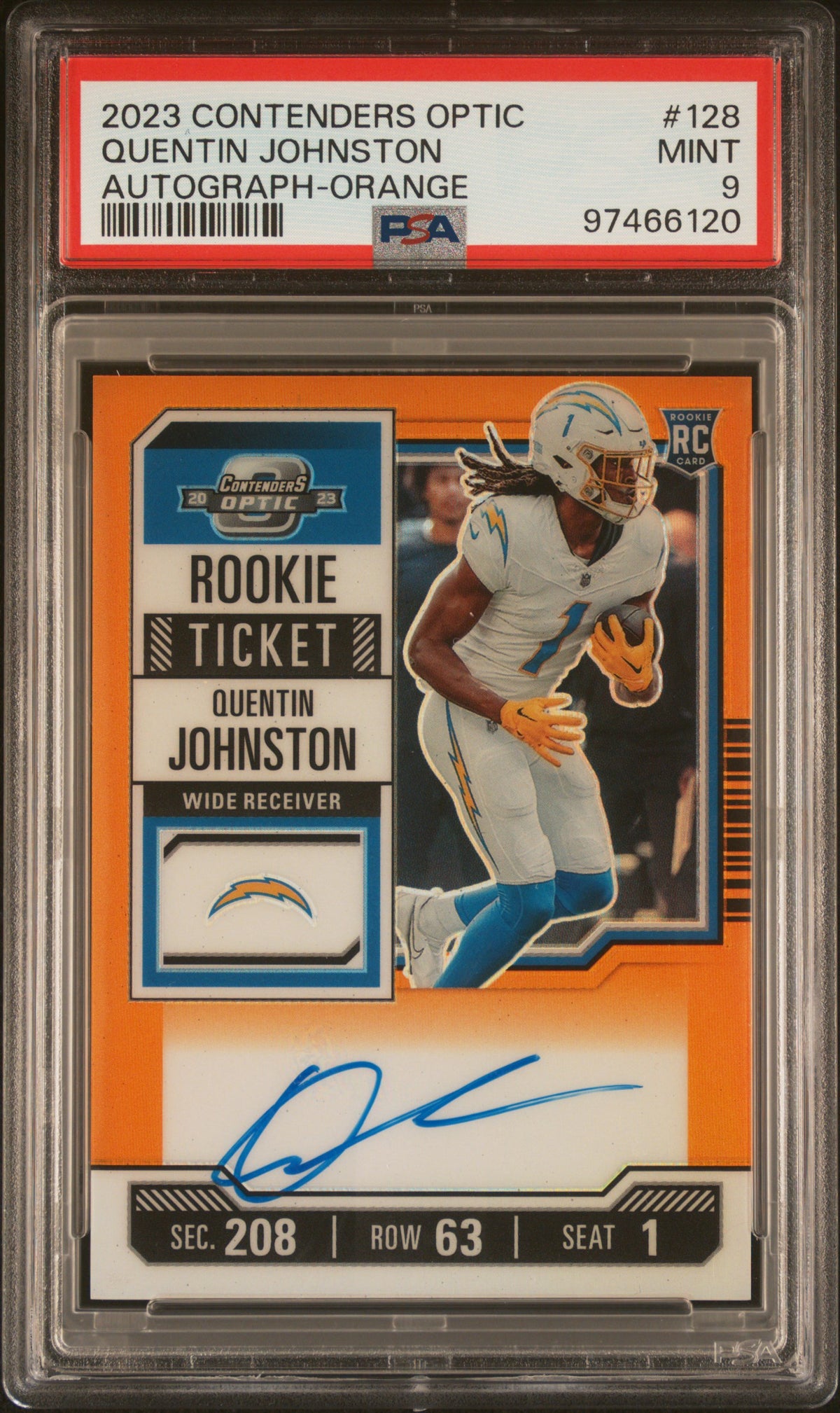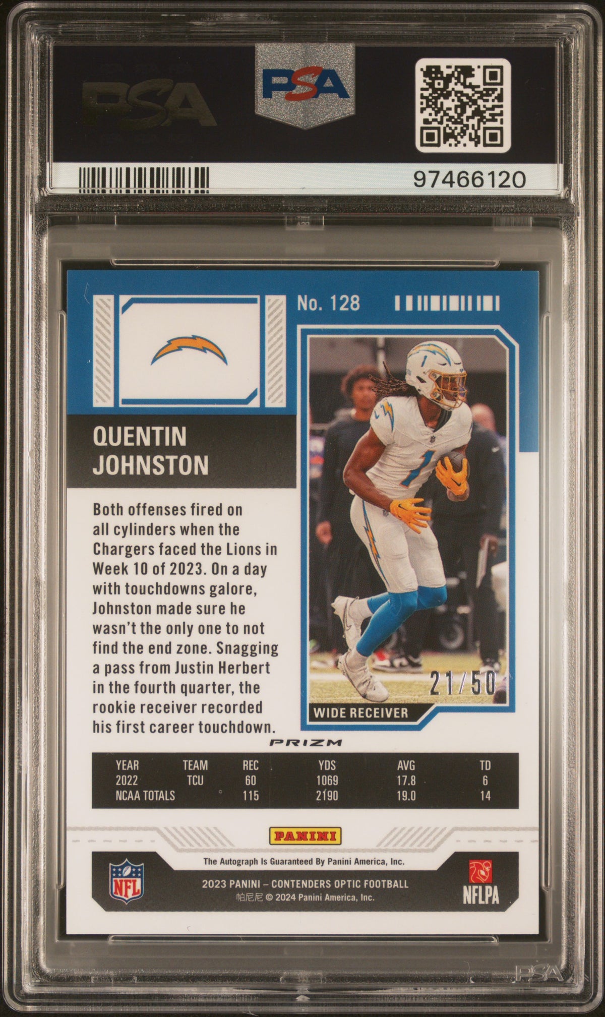 Feast your eyes on this magnificent gem, a 2023 Contenders Optic #128 Quentin Johnston card. Manufactured by the renowned Panini, this card belongs to the highly sought-after 'Rookie Ticket' insert set. What makes this card even more special is that it's an autographed rookie card, signed by none other than Quentin Johnston himself!