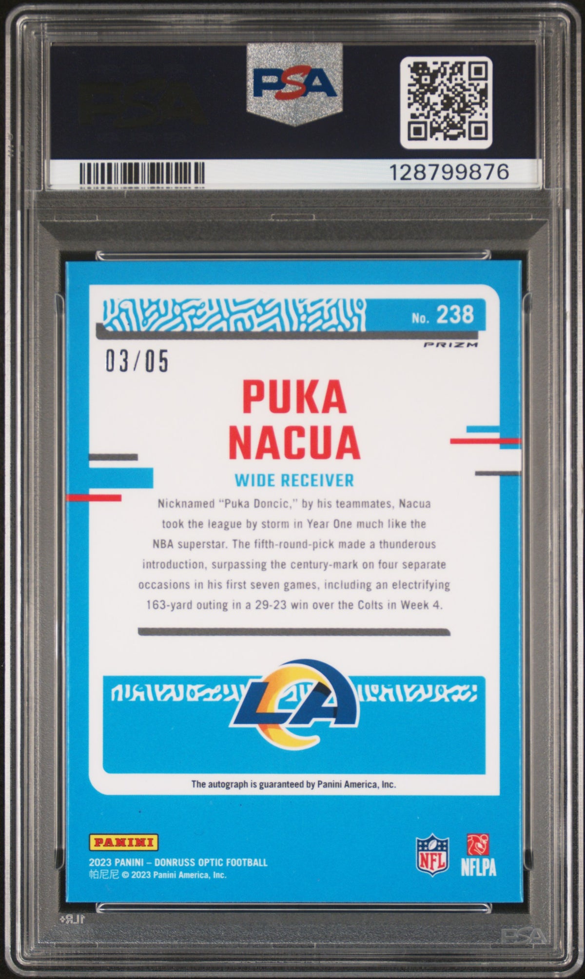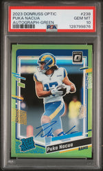 In summary, it's a card with a green autograph parallel, a rarity in the world of sports card collecting. Its serial number further marks it as an exclusive collectible. With a PSA Gem Mint 10 grade, it's in an exceptional state, preserving the glory of Puka Nacua and the Rams in the 2023 Donruss Optic set.