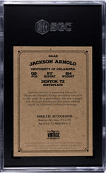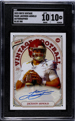Step into the world of sports collectibles with this truly impressive 2023 Onyx Vintage Jackson Arnold Blue Parallel card. This card is a testament to the talent and potential of Jackson Arnold, a standout player from the University of Oklahoma. It's a much-desired piece that's professionally graded by SGC, with a perfect numeric grade of 10, resonating its immaculate Gem Mint condition. This card not only exudes quality but also exclusivity, with it being an autographed piece. It's a brilliant addition to any collector's portfolio and an absolute must-have for any fan of Arnold or the University of Oklahoma. Manufactured by Onyx under the Vintage brand, this card carries a legacy of quality and trust. This isn't just a sports card; it's a piece of sports history in your hands. With its key features including an autograph, blue parallel, and SGC Gem Mint 10 grade, this card is more than just a collectible - it's a treasure. Grab this masterpiece to enhance your collection with the charm and elegance of the 2023 Vintage Jackson Arnold Blue card. Don't miss the opportunity to own this exceptional piece of sports memorabilia. Remember, good things come to those who don't wait!