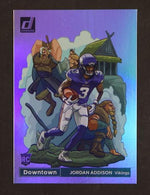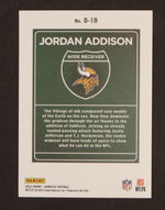 This card represents an opportunity to own a piece of the early career of a potential football star. Whether you're a fan of the Vikings, an admirer of Addison's prowess on the field, or simply a card enthusiast, the 2023 Donruss D-18 Jordan Addison card is a superb addition to your collection. The card embodies the thrill of the game and the passion of those who play it, making it a prized possession for any sports enthusiast.