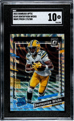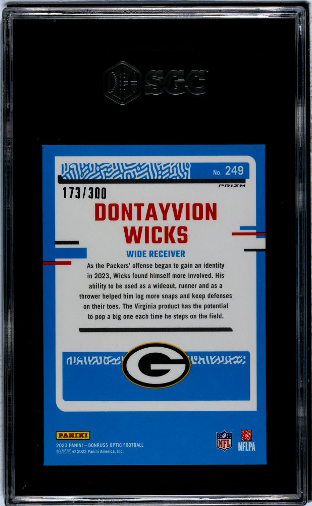 Step into the world of NFL with this remarkable sports card of the talented Dontayvion Wicks! A must-have for any fan or collector, this card is manufactured by the renowned Panini and falls under their coveted 'Donruss Optic' brand. It hails from the 2023 collection, carrying a unique card number 249.