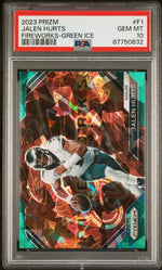Feast your eyes on this exceptional sports card featuring the dynamic and talented Jalen Hurts of the Philadelphia Eagles. This is not just any card, it's a 2023 Panini Prizm card from the highly sought-after Fireworks-Green Ice insert set. The vibrant colors and exquisite detail of this card truly capture the spirit of the NFL and the electrifying playstyle of Hurts.