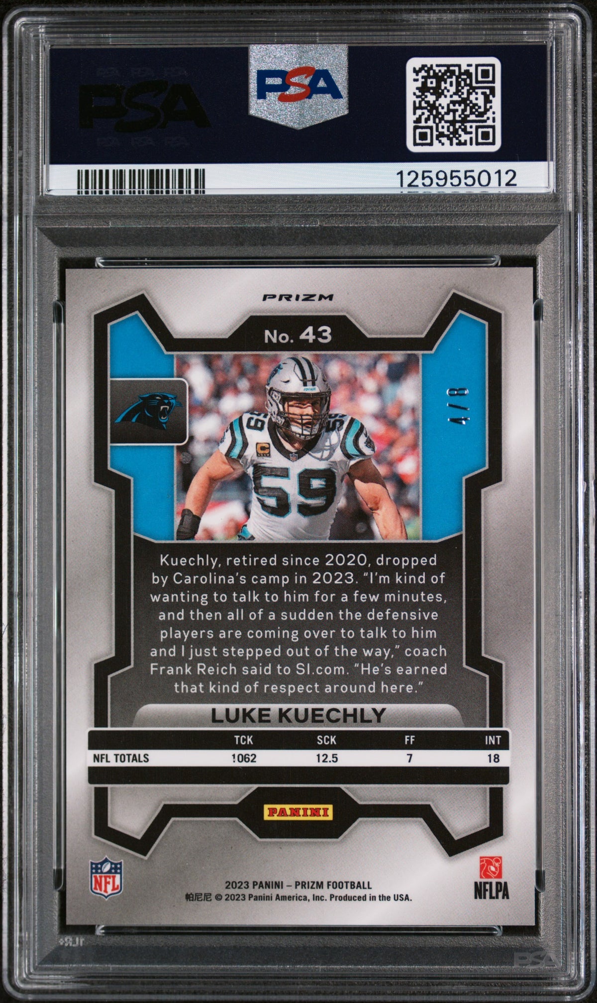 In essence, this 2023 Prizm #43 Luke Kuechly Green Sparkle card is a celebration of Luke Kuechly's talent, a tribute to the Panthers, and a gem in the world of football card collecting. Its limited availability, high grading, and association with a revered player make it an irresistible acquisition for any collector. Make this card yours and enjoy the prestige it brings to your collection!