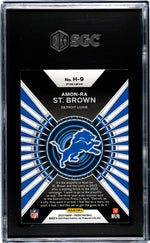In summary, this 2023 Prizm H-9 Amon-Ra St. Brown Green Prizm card, from the 'Hype' insert set, is a piece of NFL history that deserves a special place in your collection. Its unique features, coupled with the impeccable Gem Mint 10 grading from SGC, make it a must-have for any true sports card enthusiast.