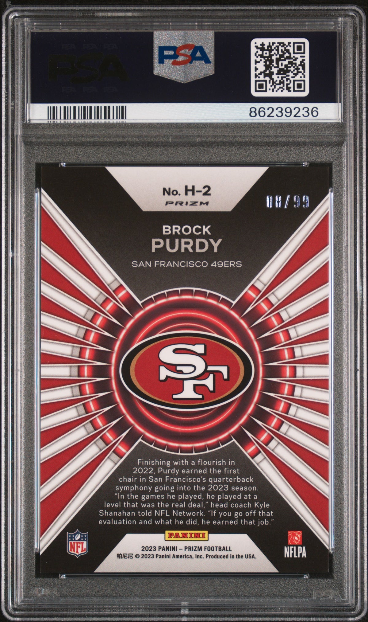 In summary, the 2023 Prizm H-2 Brock Purdy card from the 'Hype-Blue Ice' Insert Set is an exquisite piece of memorabilia. It is not just a card, but a tribute to Brock Purdy and his contribution to the San Francisco 49ers and the NFL. Its exceptional condition and unique design make it a must-have for all football enthusiasts and collectors. Don't miss the chance to add this gem to your collection!