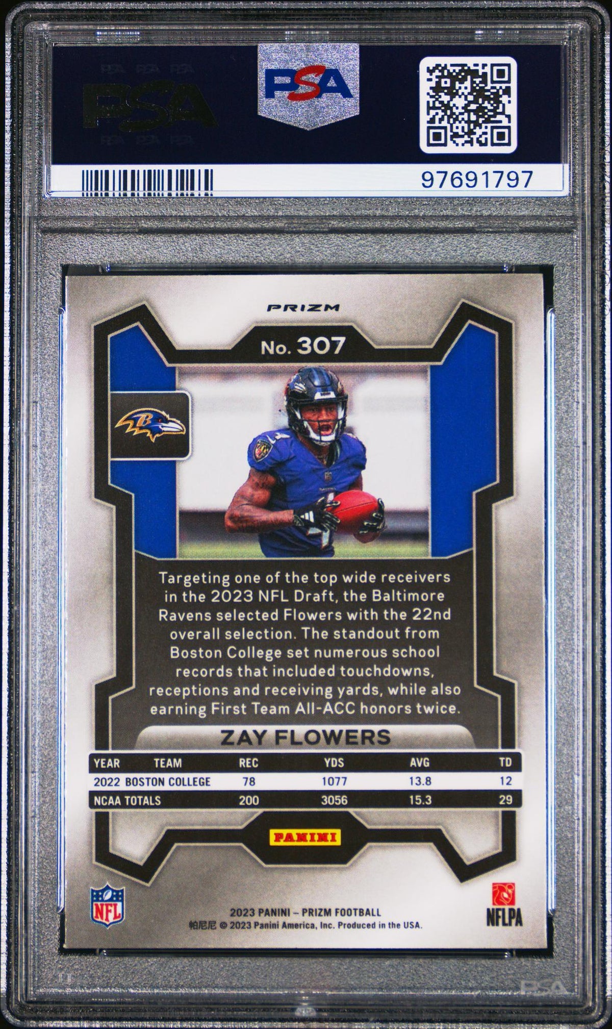 Unearth the gem in your sports card collection with this majestic 2023 Prizm #307 Zay Flowers from the eminent manufacturer Panini. This ravishing rookie card is a glorious celebration of Zay Flowers' incredible talent as he soars in his career with the NFL team, the Ravens. This card is a part of the highly coveted 'Red Sparkle' insert set, making it a brilliant standout in any collection. This card is not just a rookie card, it is a testament to Flowers' undeniable prowess on the field. The card's red sparkle parallel design adds an extra dash of excitement and eye-catching appeal, making it a must-have for any serious collector. But the allure of this card doesn't stop at its design. This card has been professionally graded by PSA, a trusted name in the sports card community, and has received a high numeric grade of 9, confirming its mint condition. This card's pristine condition is a testament to the care and precision with which it has been preserved. Adding further to its charm, the card is from the 2023 Prizm Football set, a well-regarded collection in the sports card industry. This card of Zay Flowers, an emerging star in the NFL, is an excellent representation of his potential and skill. The card does not include any memorabilia, allowing the focus to remain solely on the showcased player. In conclusion, this 2023 Prizm #307 Zay Flowers card, with its red sparkle parallel and mint condition, is a fantastic addition to any sports card collection. Its professional grading by PSA ensures its authenticity and quality, adding significant value. Whether you're a dedicated fan of Zay Flowers, a Ravens devotee, or a serious card collector, this card is an exceptional pick to enhance your collection. It represents not just a player, but a moment in sports history, a snapshot of a promising career at its dawn.