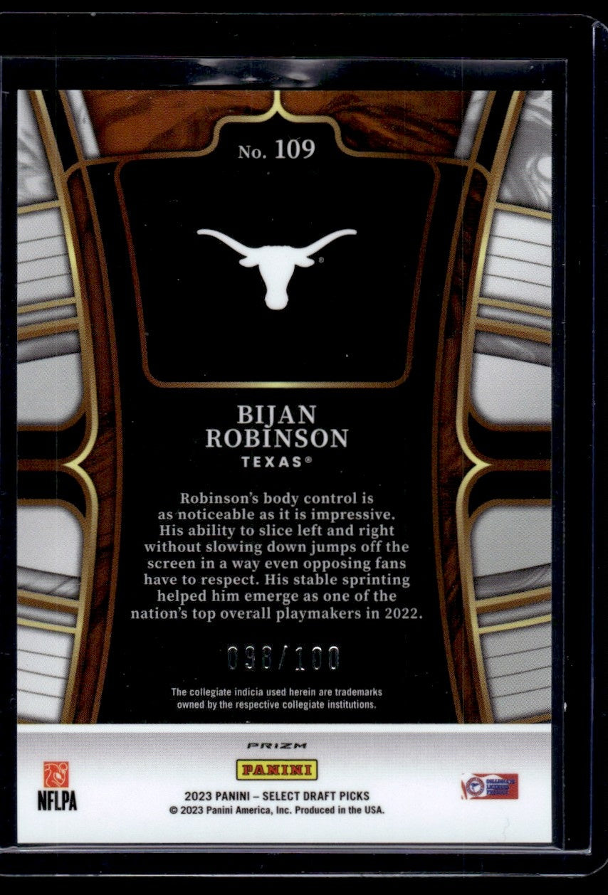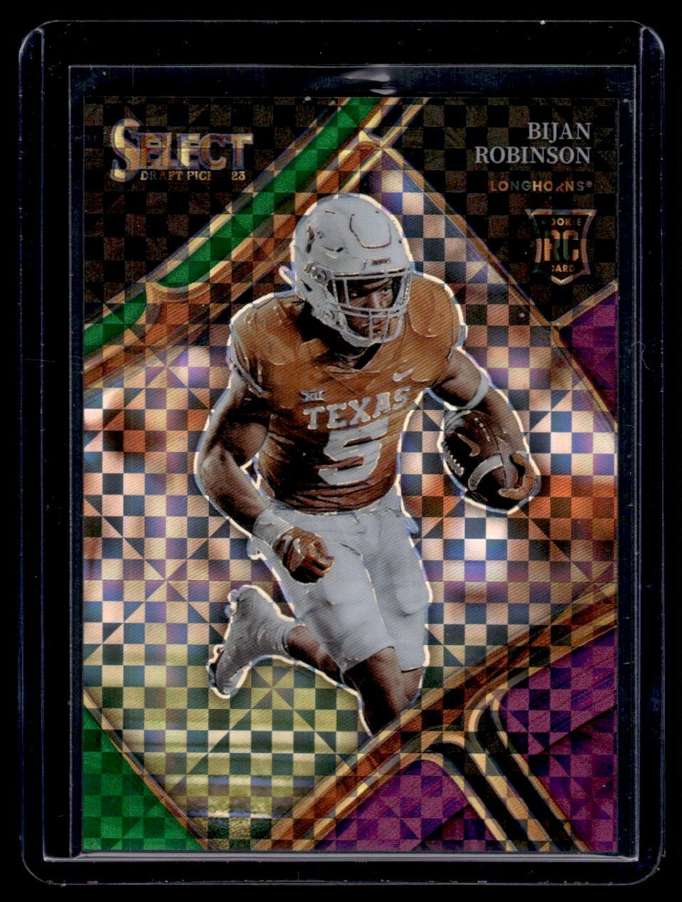 Step into the future of football with this exquisite 2023 Panini Select Bijan Robinson rookie card. This unique offering is not just a card, but a piece of sports history, featuring one of the most promising talents in the field, Bijan Robinson.