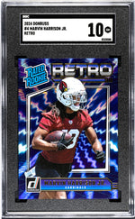 Key features of this card include its 'Rated Rookie' status, the featuring of Marvin Harrison Jr., its Gem Mint 10 condition, its association with the Arizona Cardinals, and its manufacture by Panini Donruss in the year 2024. A card like this doesn't come around every day. Act now and secure a piece of NFL history with this stellar Marvin Harrison Jr. Rated Rookie Retro card!