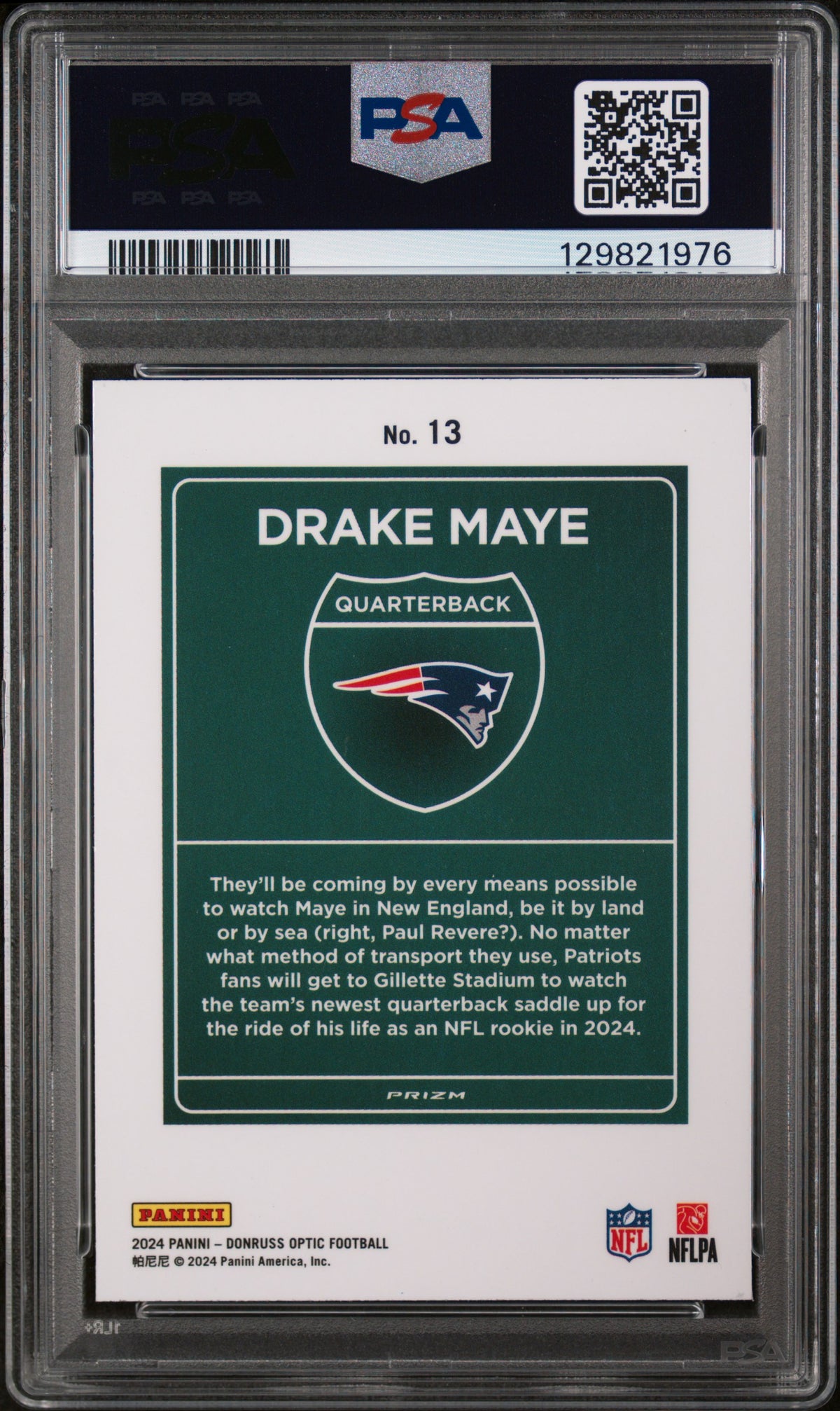 Whether you're a fan of Drake Maye, a Patriots supporter, or an avid card collector, this card is sure to be a remarkable addition to your collection. Its rarity, key features, and high grading make it a valuable and sought-after piece. Secure this 2024 Donruss Optic 13 Drake Maye card today and own a piece of NFL history!
