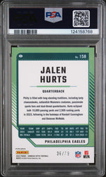 The card features Jalen Hurts, the formidable talent of the Philadelphia Eagles, captured in a moment of athletic prowess that is sure to delight any NFL fan. It stands as a shining tribute to his contribution to the sport, making it a must-have for any collector or enthusiast.