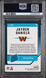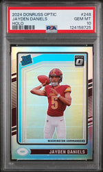 This 2024 Donruss Optic 248 Jayden Daniels Holo card is not just a card, but a piece of history. It encapsulates the early days of Jayden Daniels's career, making it a must-have for any serious collector. Its key features such as the Rated Rookie status, the Holo parallel, and the perfect PSA 10 Gem Mint condition make it a truly remarkable find.