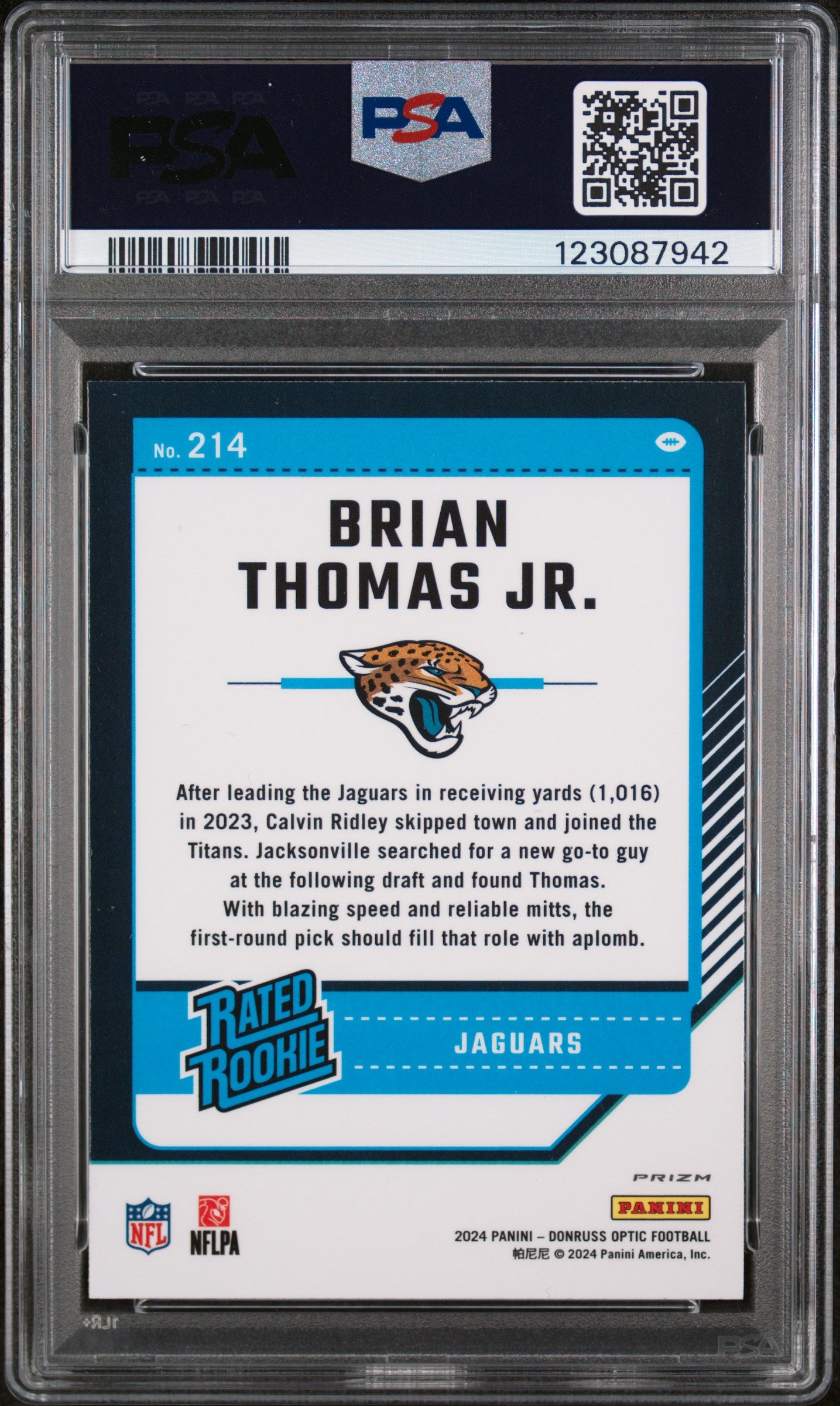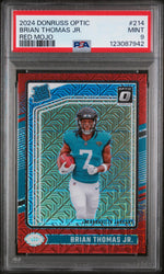 This card is a celebration of Brian Thomas Jr.'s rookie year, a testament to his potential and a symbol of his budding career in the NFL. Its key features include 'Rated Rookie', 'Red Mojo Parallel', 'Mint condition', and 'PSA 9'. Add this 2024 Donruss Optic Brian Thomas Jr. card to your collection and own a piece of football history. This is more than just a card - it's an investment in the legacy of a rising star!