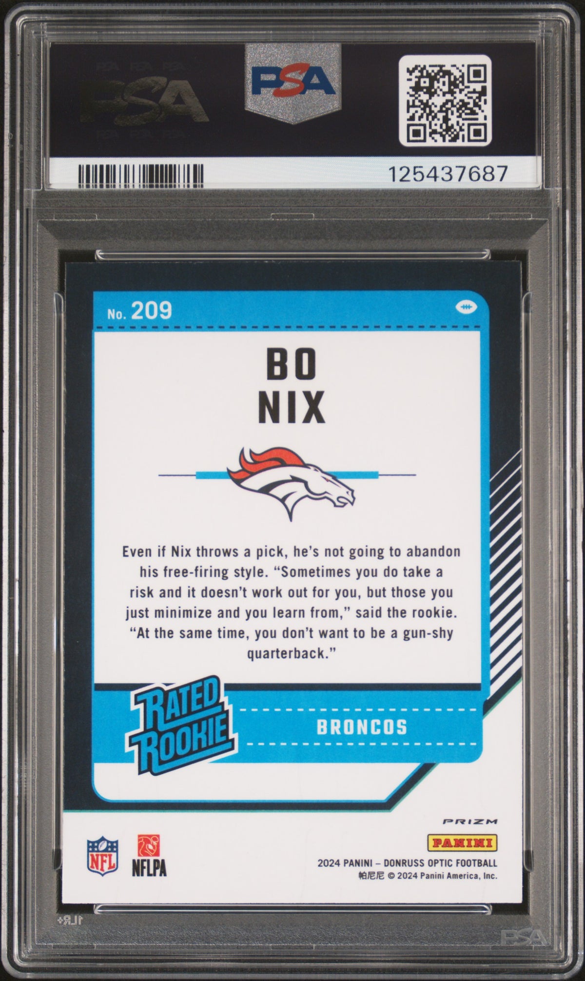 Delve into the thrill of sports card collecting with this dazzling 2024 Panini Donruss Optic #209 Bo Nix card! Boasting the highly sought-after 'Rated Rookie' status, this card captures the essence of Nix's dynamic rookie season with the Denver Broncos in the NFL.