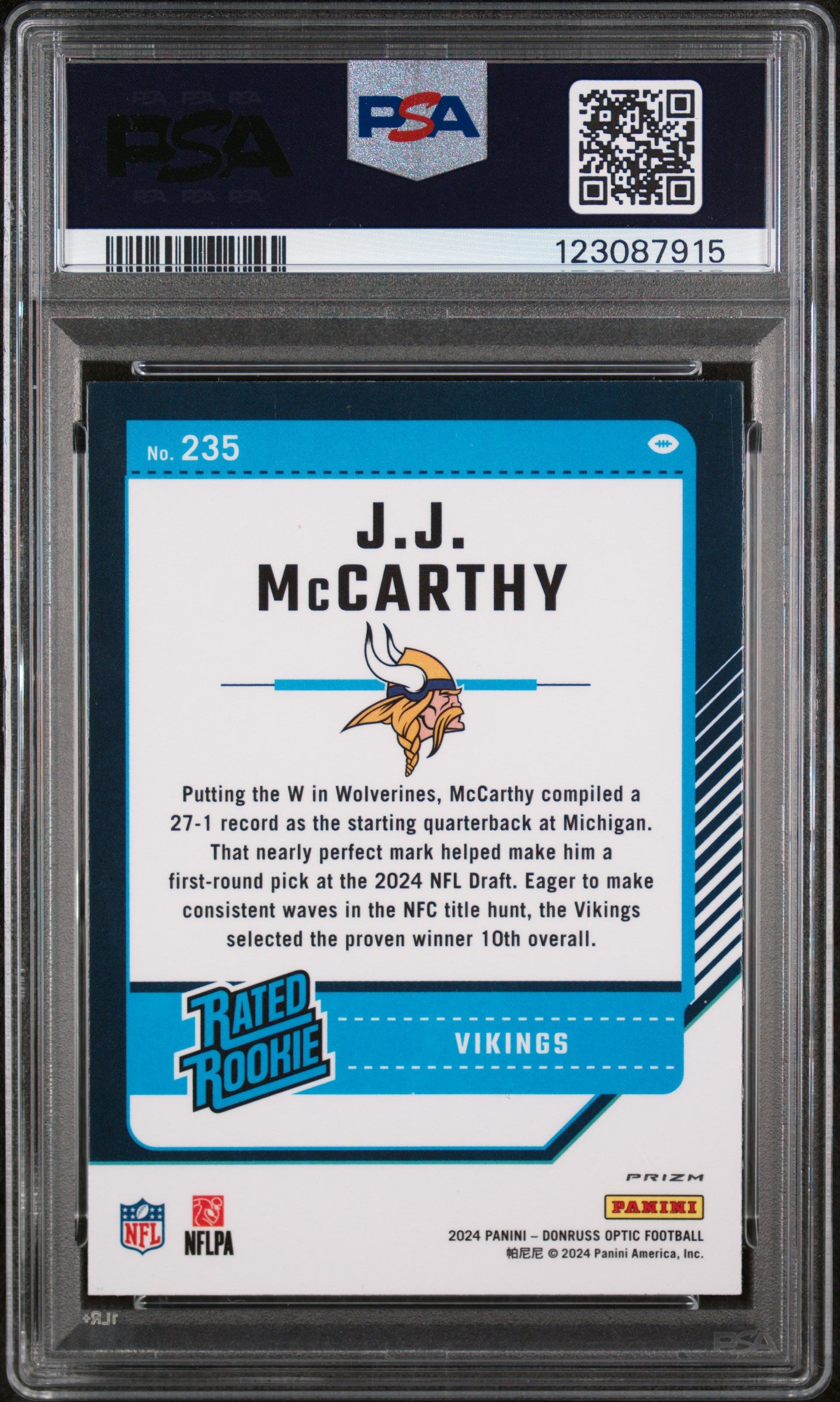 In conclusion, this 2024 Donruss Optic #235 JJ McCarthy card is a testament to the player's prowess and an exciting part of the NFL's rich history. Its unique features and high grade make it an excellent addition to any sports card collection. Don't miss the opportunity to own this piece of sports memorabilia, encapsulating the essence of the exciting world of football.
