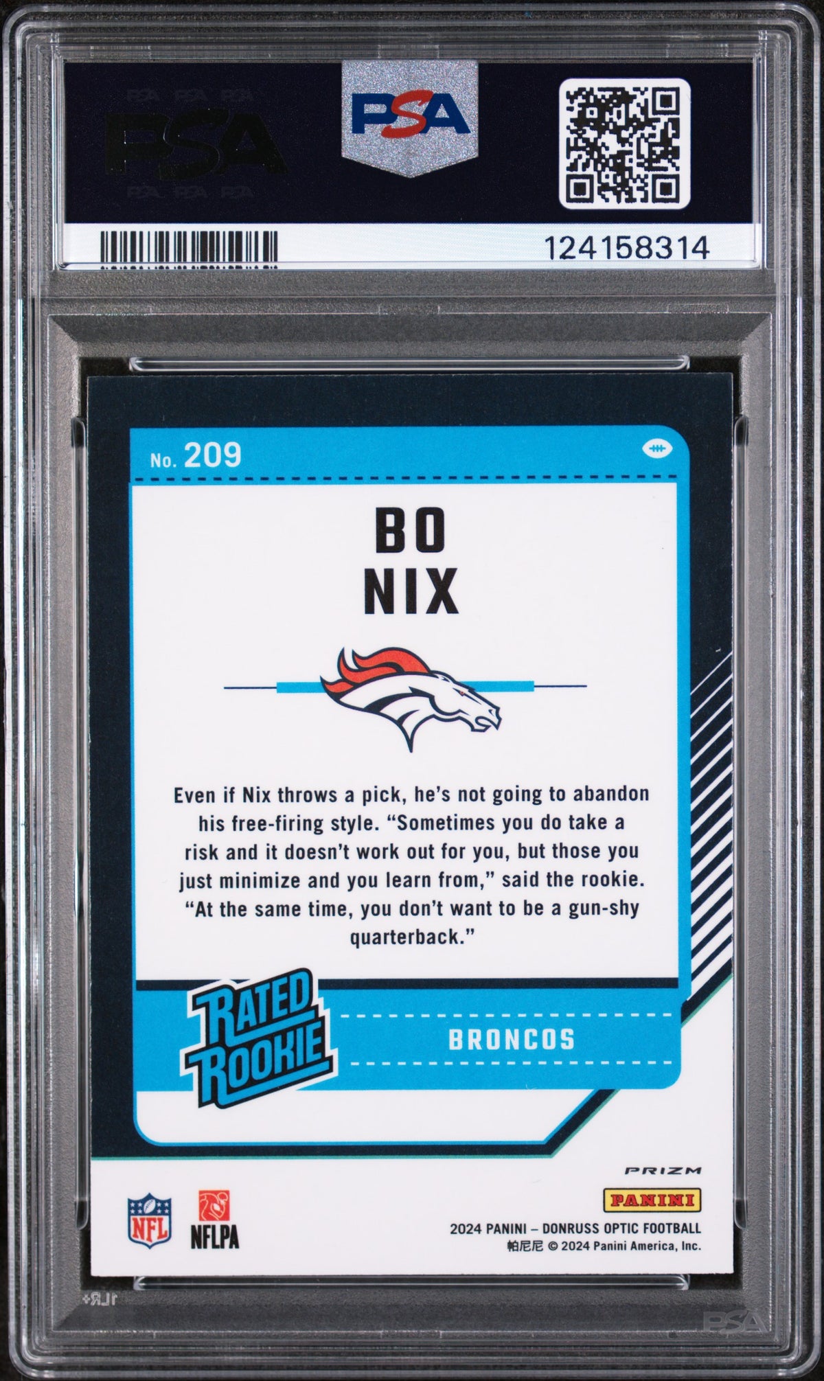 The 2024 Donruss Optic #209 Bo Nix Stars card is a pride of the Donruss Optic Football set. The key features of this card, including the 'Rated Rookie' status, the association with the Denver Broncos, its mint condition, the PSA grading, its place in the Donruss Optic series, and the 2024 Stars Insert, make it an irresistible piece for collectors and NFL enthusiasts alike.