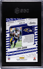 Behold the sheer magnificence of this 2024 Absolute #9 Lamar Jackson card manufactured by the renowned Panini. This absolute gem of a card features the dynamic and talented Lamar Jackson, the unstoppable force of the Baltimore Ravens, in all his glory. The card belongs to the highly sought-after Panini Absolute Football set, making it a must-have for every serious NFL collector.