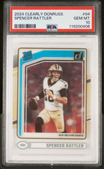 Behold the gem of your sports card collection - the 2024 Clearly Donruss #94 featuring the promising talent, Spencer Rattler. An exquisite piece from renowned manufacturer, Panini, this card belongs to the highly sought-after 'Rated Rookie' Insert Set, making it a must-have for both ardent collectors and NFL enthusiasts. The card features Rattler in his prime with the New Orleans Saints, capturing the essence of the NFL's dynamism and Rattler's athletic prowess. Being a Rookie card, it holds immense potential value, representing the early stages of Rattler's professional journey within the NFL. The card's appeal is further amplified by its professional grading. It has been meticulously inspected and graded by PSA, one of the most reputable grading companies in the industry, and has achieved a stellar numeric grade of 10. This signifies the card's impeccable condition, classified as 'Gem Mint' - a term only reserved for cards of superior quality. This 2024 Clearly Donruss Football Set card is a standout with its top-tier grading and featuring a promising player like Spencer Rattler. Its key features, including the 'Rated Rookie' status, the association with New Orleans Saints, and the PSA 10 'Gem Mint' grading, make it a highly desirable asset for any sports card collection. In the realm of football cards, this card is not just another piece, but a testament to Rattler's burgeoning career and a symbol of the NFL's vibrant spirit. It's not just a card, it's a piece of sports history that you can own. Add this to your collection and enjoy the sense of exclusivity it brings. With this card, you're not just buying a piece of cardboard, but a share in the legacy of the sport and the player it represents.