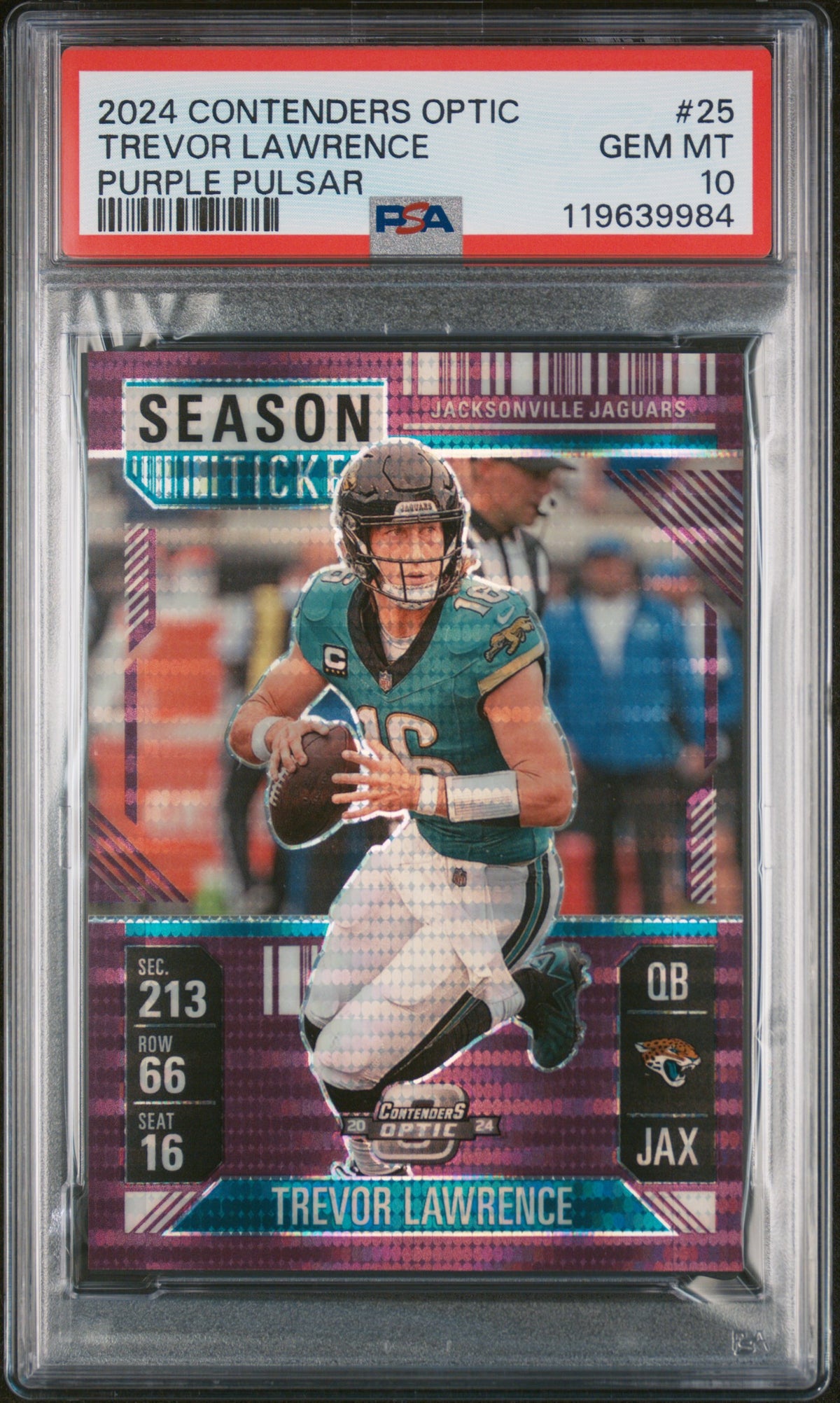 Feast your eyes on this extraordinary sports card featuring none other than the sensational Trevor Lawrence, the pride of the Jacksonville Jaguars. This 2024 Panini Contenders Optic #25 Trevor Lawrence card is an absolute gem in every sense of the word. A part of the coveted 'Contenders Optic Season Ticket' set, this card is a true standout with its captivating 'Purple Pulsar' parallel.