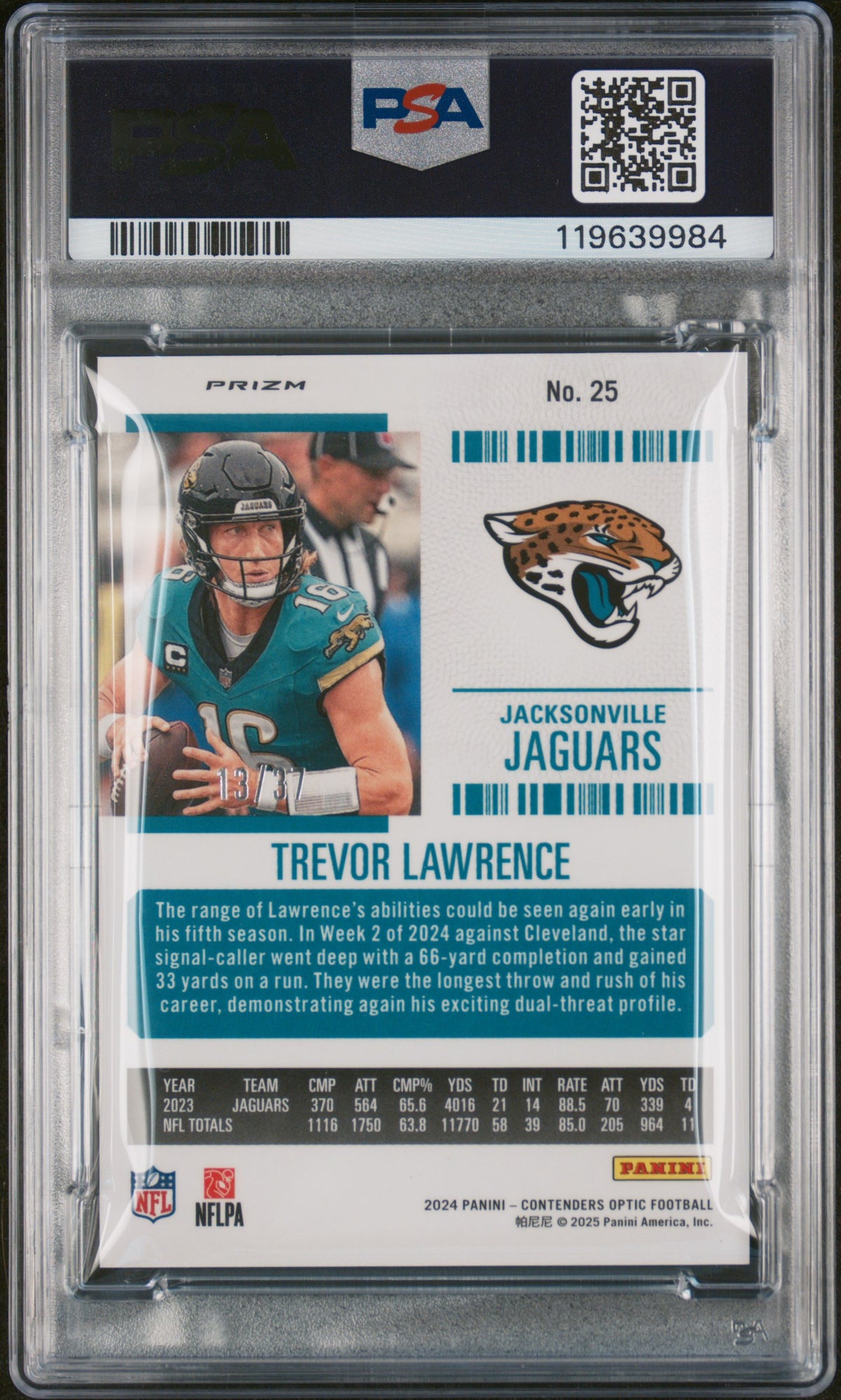 In terms of key features, this card boasts a Purple Pulsar parallel, a serial number 13/37, is graded PSA 10 Gem Mint, and of course, features the phenomenal Trevor Lawrence of the Jacksonville Jaguars.